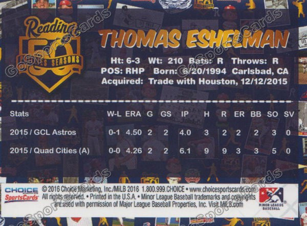 2016 Reading Fightin Phils Top Prospect 25 Thomas Tom Eshelman